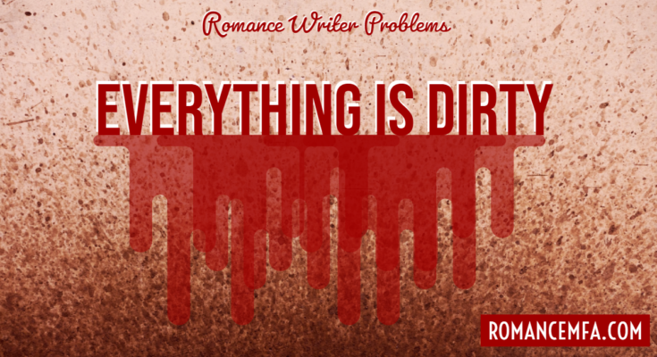 This time we’re looking at the Romance Writer Problem of “Everything is Dirty.” Do we write smutty stories because we have smutty thoughts? Or do we have smutty thoughts because we write smutty stories? Chicken or egg, romance authors see potential sexy stories wherever they go.