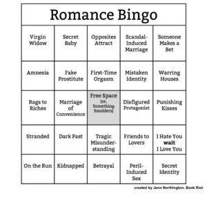 Trope – Story elements often repeated within a genre. Can be used to surprise readers if the usual expectation is subverted, or to bore them if a story consists of nothing but tropes. It behooves an author to know the tropes of their genre! Here’s a handy Romance Trope Bingo Card from this BookRiot piece on Story Tropes Bingo for (Almost) Every Genre by Jenn Northington.