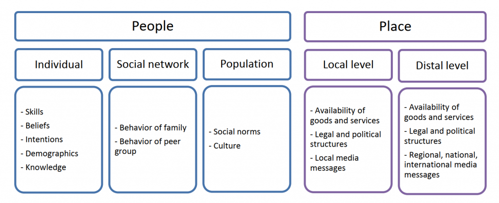 In this model, the people-related factors affecting an individual’s behavior are categorized into individual (skills, beliefs, intentions, demographics, and knowledge), social network (behavior modeling or support by those within family or peer group), population/community (social norms and culture). Place-related factors are grouped into local level (availability of goods and services, legal and political structures, and media messages at home, school, work, and city) and distal level (availability of goods and services, legal and political structures, and media messages in state, regional, national and international area).[92]